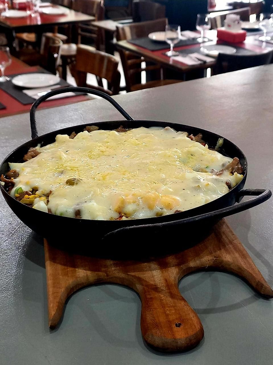 Pastel de papa con la parte de arriba de salsa blanca gratinada para que sea más liviano. Para chuparse los dedos.