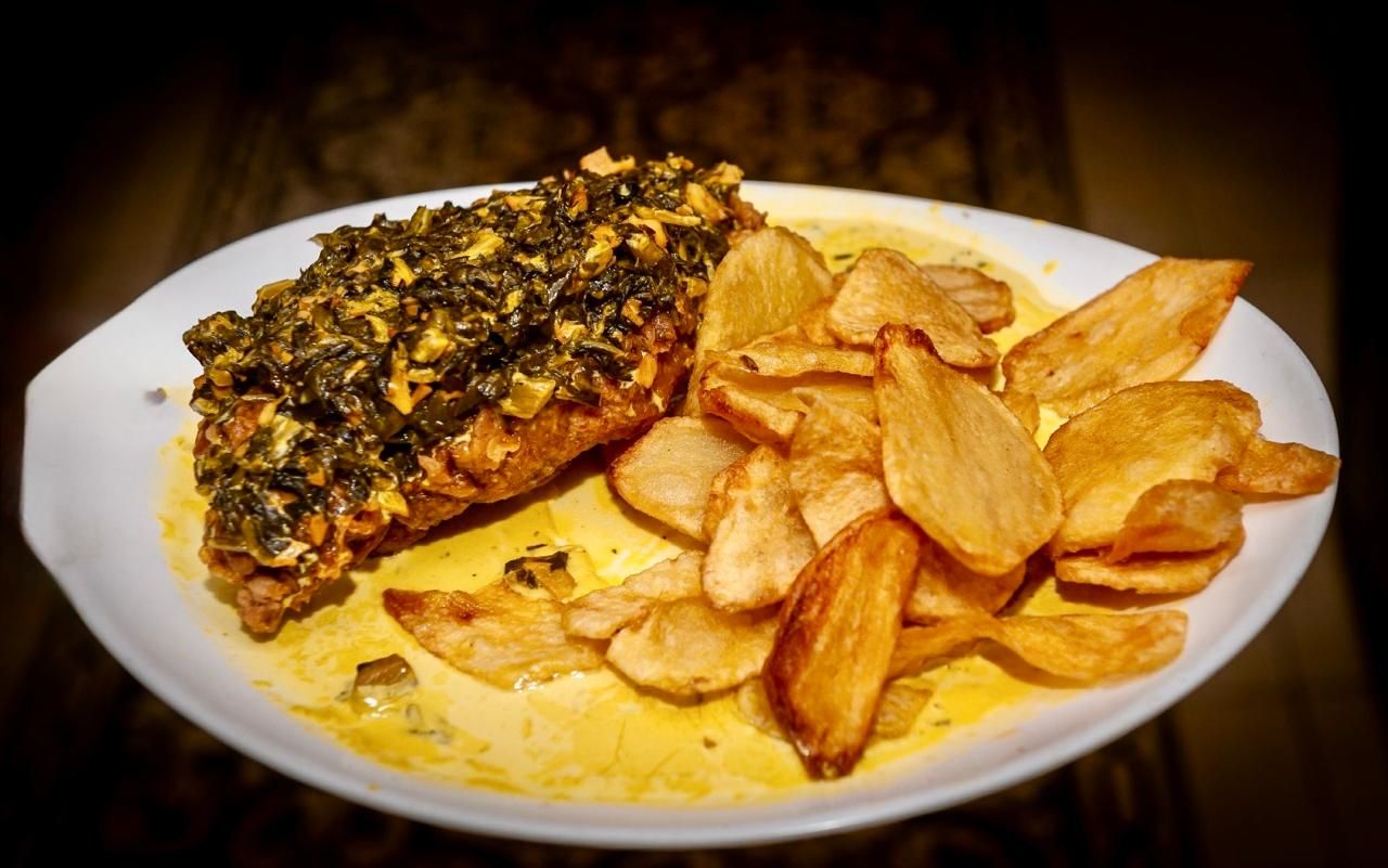 Suprema Imperial: Suprema de pollo rellena con jamón y queso con salsa de crema leche, yema de huevo y espinaca, acompañada con papas españolas.