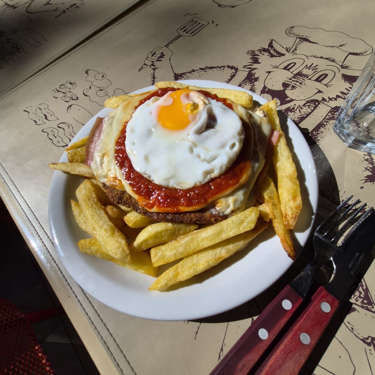 Milanesa de peceto a la napolitana con papas fritas y huevo frito.