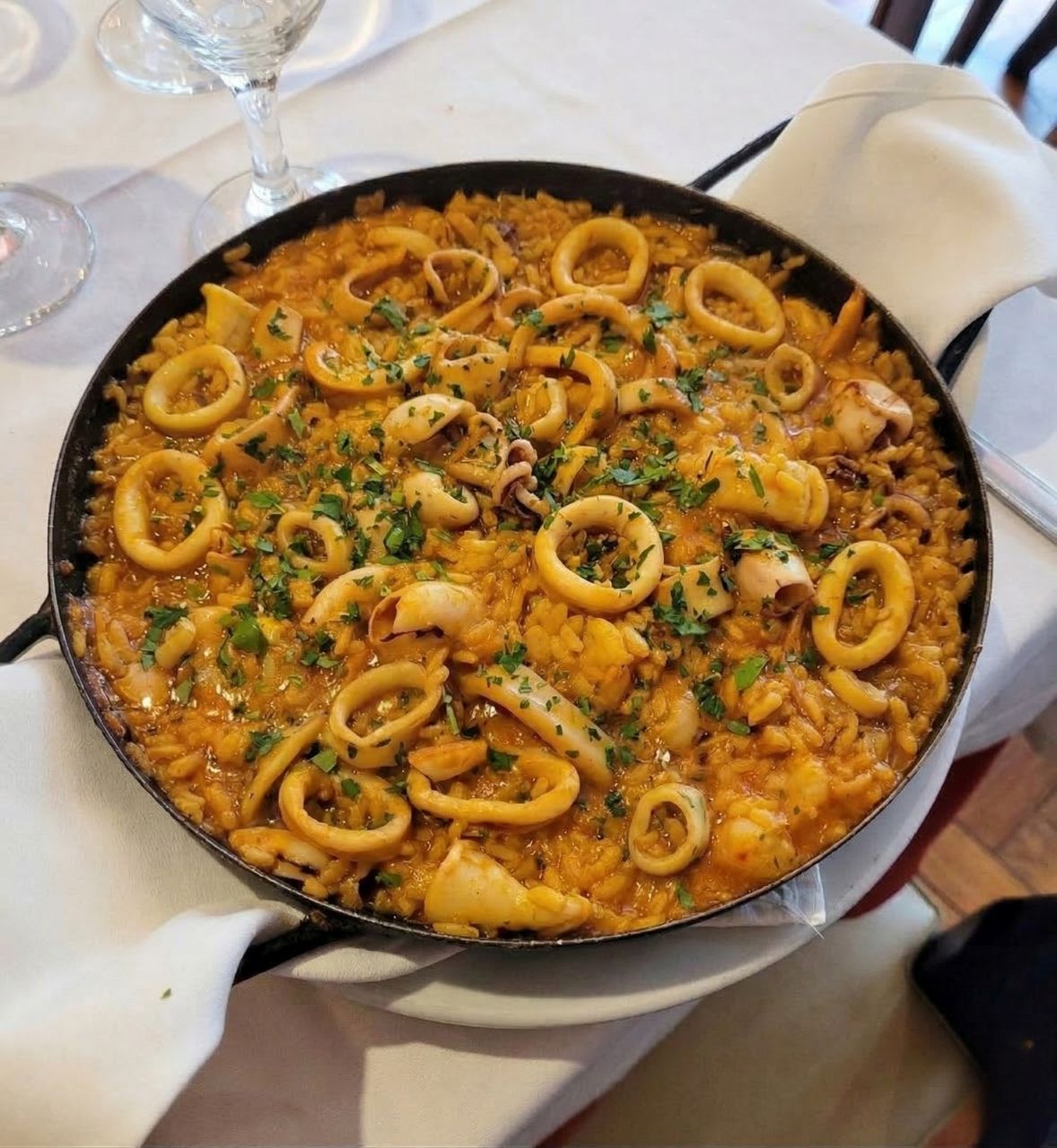 Mucho calamar, anillos súper tiernos y ese color dorado intenso que solo el azafrán y un buen fondo de cocción pueden lograr. Es el plato perfecto para los que sabemos que la felicidad se sirve en cazuela caliente y con mucho aroma.
