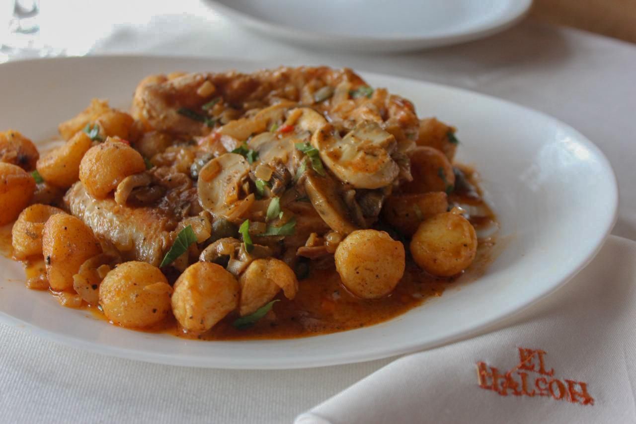 Pollo grillado con salsa húngara (cebolla, morron, alcaparras, champiñón, vino blanco, crema y papryka). Sale con papas noissette.