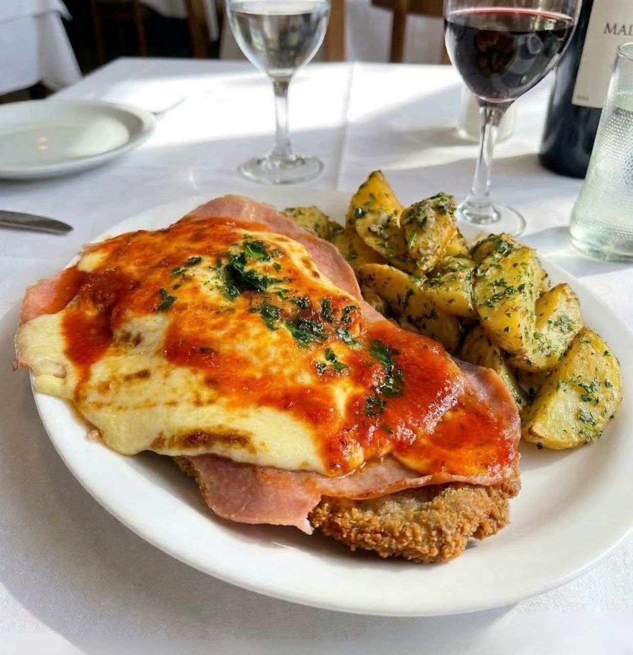 No es cualquier milanesa. Es un emblema de La Segunda, nuestro bodegón en Villa del Parque con 20 años de trayectoria alimentando el corazón del barrio. Empezamos con un bife de chorizo tierno y jugoso, lo pasamos por pan rallado y luego lo coronamos con la santísima trinidad: salsa de tomate casera, jamón cocido de primera y una montaña de queso fundido y gratinado al horno hasta que hace burbujas.